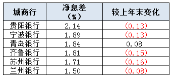 在公布净息差的上述6家银行中,有5家有所下滑。其中,苏州银行、齐鲁银行、贵阳银行、宁波银行降幅均超过10个基点。