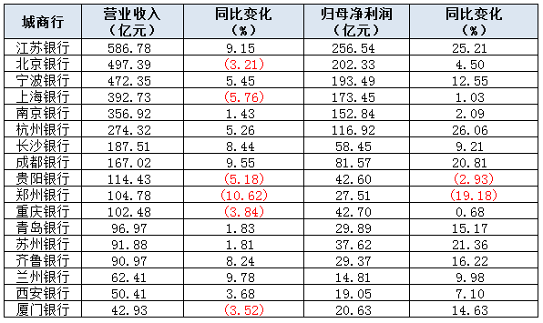 从归母净利润情况看,前三季度,江苏银行、北京银行、宁波银行、上海银行、南京银行、杭州银行前三季度归母净利润均超100亿元,位列上述城商行前列;归母净利润增速方面,有15家上市城商行净利润增速为正,仅贵阳银行、郑州银行2家银行增速为负,其中,郑州银行净利润大跌近20%,在上述城商行中增速垫底。