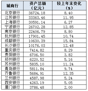 另外,与上年末相比,资产规模排名前三的银行座次依旧未变。具体来看,北京银行以总资产3.67万亿元位居榜首;江苏银行总资产排名第二,资产规模达3.34万亿元;上海银行排名第三,资产规模为3.06万亿元。