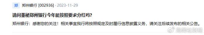 在2023年4月3日的业绩说明会上,针对多名投资者提出的“为何三年不分红”这一问题,郑州银行副行长、财务负责人孙海刚进行了回应:一是面对近年复杂多变的宏观经济形势,该行积极践行地方金融机构社会责任,加大对中小企业帮扶力度,持续让利实体经济,盈利能力受到一定影响。二是随着经济下行压力加大,风险持续暴露,该行不断加强风险的前瞻管控,加快推进不良资产处置速度,制定风险化解处置方案,加大拨备计提力度,顺应监管引导留存未分配利润将有利于该行进一步增强风险抵御能力,为保持经营稳定提供保障。三是商业银行资本监管政策要求日益趋严,内源性的资本补充是中小银行保证资本充足、特别是核心一级资本充足水平的重要途径,留存的未分配利润将用作核心一级资本的补充,有利于提升资本充足水平,以支持该行的战略转型及长期可持续发展,维护投资者的长远利益。照这么说,不分红还是为了公司的可持续发展,为了维护投资者的长远利益,不过,投资者显然不这么认为。多名投资者在互动平台、股吧等平台表达不满。2023年11月,又有投资者提问:“今年会分红吗?”对此,郑州银行的答复依然是将按照规定及时履行信披义务,请关注后续公告。