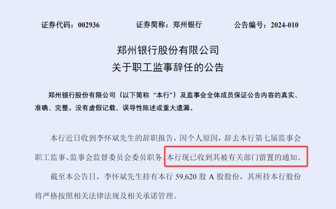据郑州银行公告披露,李怀斌因个人原因辞去职工监事等职务。该行同时透露,已收到李怀斌被有关部门留置的通知。