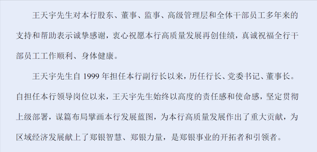 彼时,郑州银行对王天宇给予了高度评价,称其以超强的才能和丰富的行业经验,为该行发展作出了重大贡献,受到全行上下的尊敬,为区域经济发展献上了郑银智慧、郑银力量,是郑银事业的开拓者和引领者。