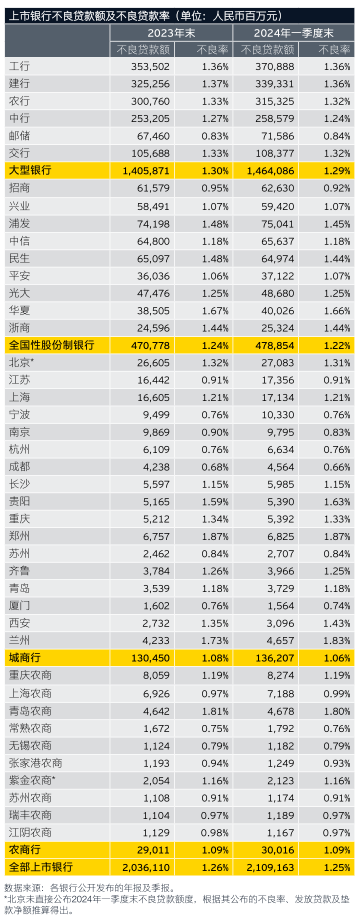资产质量方面,安永报告显示,42家上市银行2024年一季度末不良贷款额相比2023年末增加730.53亿元,今年一季度不良贷款额为21091.63亿元,加权平均不良贷款率为1.25%,较去年末下降0.01个百分点。