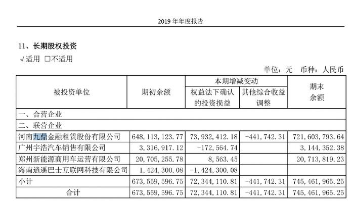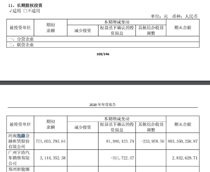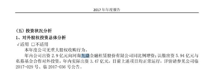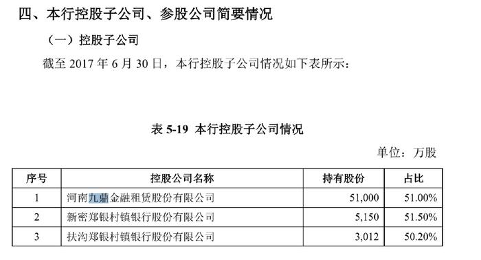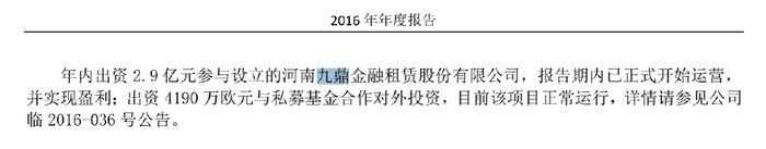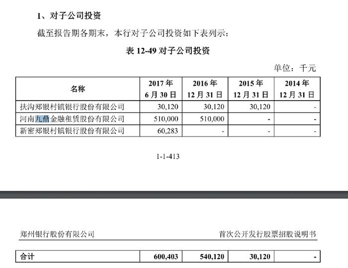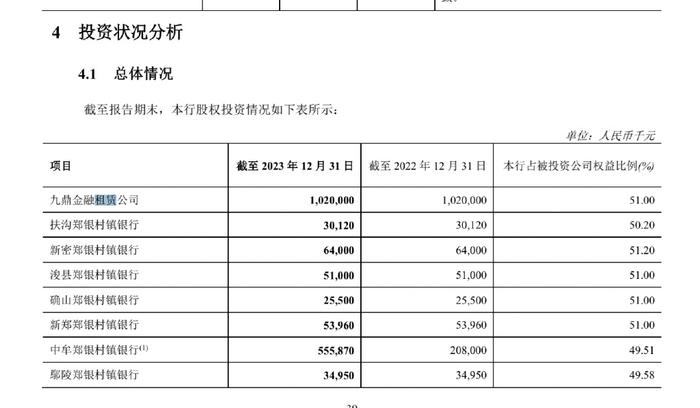 3、郑州银行的各期年报显示,郑州银行对于九鼎金租的账目估值从未改变,郑州银行总投资公司10.02亿,占九鼎金租的51%股份。但九鼎金租的所有租赁收入等都算郑州银行的。