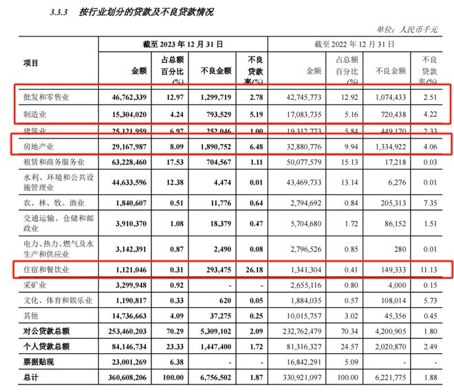 对公贷款中,贷款金额占比、不良率较高的三个行业分别是“批发和零售业、制造业、房地产业”,且三个行业的贷款相较2022年呈继续恶化趋势,占比较小的“住宿和餐饮业”不良率甚至暴增到惊人的26.18%,为何这几个行业会如此不争气?参考下河南房企暴雷和富士康相关新闻,或许可以找到答案,而这些都不是郑州银行能够左右的。
