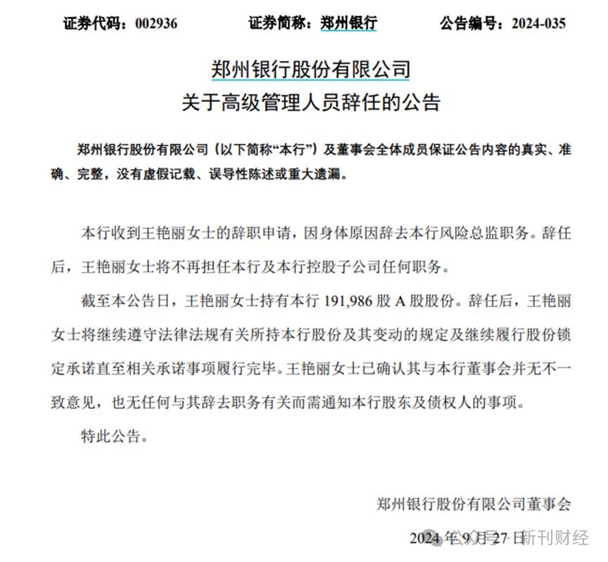根据郑州银行9月27日公告,该行收到王艳丽的辞职申请,辞任后,其将不再担任本行及本行控股子公司任何职务。