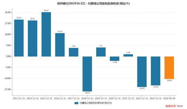 早在2022年、2024年上半年时,郑州银行的净利润增速就在A股银行中垫底,2023年只比浦发银行稍好——排在倒数第二。