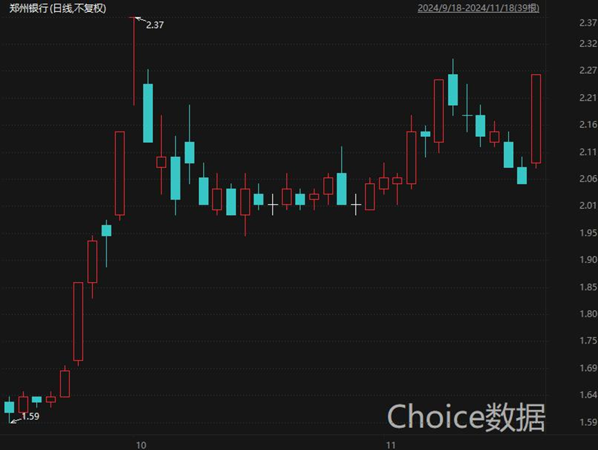 郑州银行是11月18日当天A股上市银行中仅有的两支涨停股之一,算是此次涨停,近两个月以来,郑州银行已收获了4个涨停板,自今年9月18日的低点以来,该行股价累计涨幅达到38.65%。
