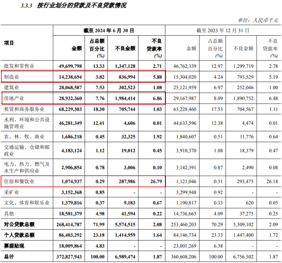 郑州银行披露的2024年半年度报告显示,截至报告期末,该行对公贷款不良金额55.75亿元,不良贷款率2.08%。其中,住宿和餐饮业不良金额,2.88亿元,不良贷款率26.79%;房地产业不良金额19.84亿元,不良贷款率6.86%;制造业不良金额8.37亿元,不良贷款率5.88%。