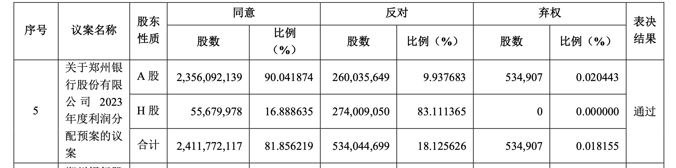 6月27日晚间,郑州银行公示“零分红”的2023年度利润分配预案已通过股东大会审议,但其中H股参会股东反对比例已高达83.11%。