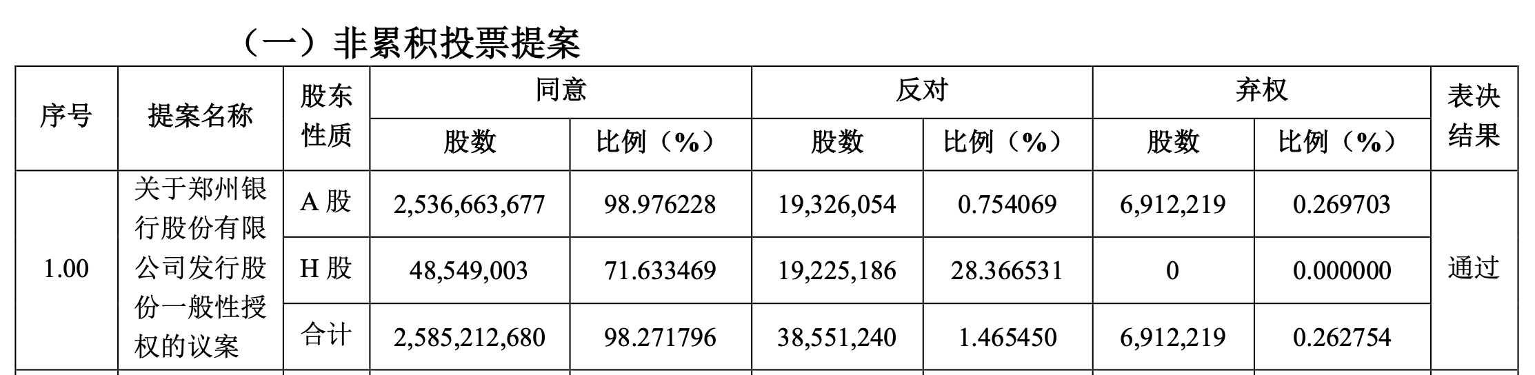曾在年中“四年不分红”收到中小股东质询函的郑州银行(002936.SZ),又因发行股份议案在股东大会上遭遇大诸多H股股东反对。