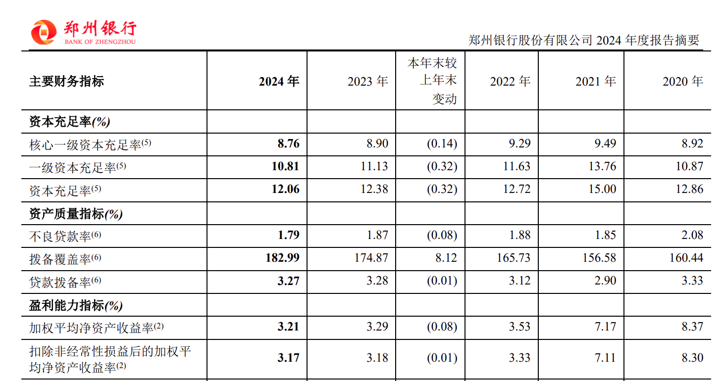 另外,该行此前一直未进行现金分红,原因之一或与其下降的资本充足率有关,要留存利润来补充资本抵御风险。从2021年到2024年,郑州银行的资本充足率从15.00%降至12.06%;一级资本充足率从13.76%降至10.81%;核心一级资本充足率从9.49%降至8.76%。