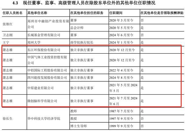 此外,在郑州银行董监高中,也存在部分董事、监事兼职情况严重的问题。其中,2025年新上任的独立董事萧志雄同时在包括郑州银行的7家企业担任独立董事,而在这7家企业均为上市企业。