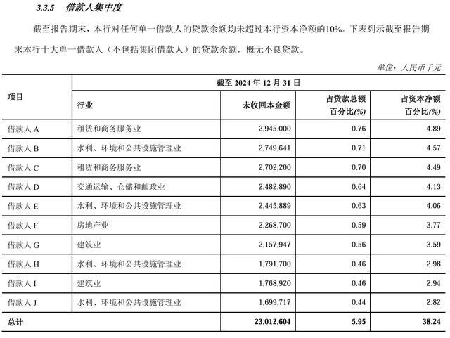截至2024年末,郑州银行的最大十家单一客户贷款比例上升2.88个百分点,达到38.24%,单一最大集团客户授信比例上升2.12个百分点,达到11.44%,距离监管红线更进一步,而在该行的最大十家单一客户的所属行业中也不乏高不良率行业。