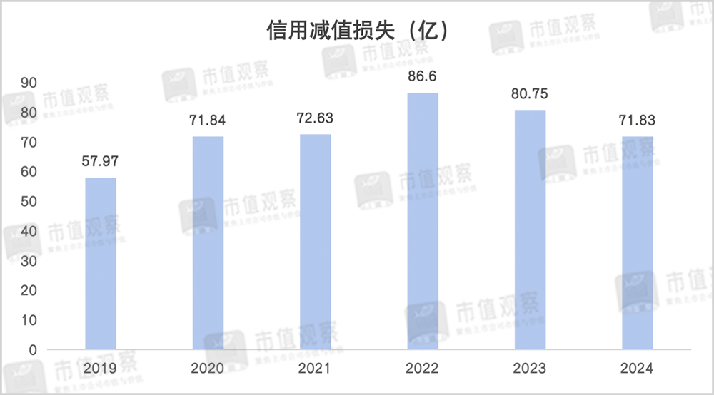 郑州银行较高的不良率引发了诸多负面反应,一是直接导致了大量的信贷减值损失,虽然近年来规模在下降,但2024年计提的71.83亿依然是同期净利润的3.86倍,严重侵蚀了净利润空间。