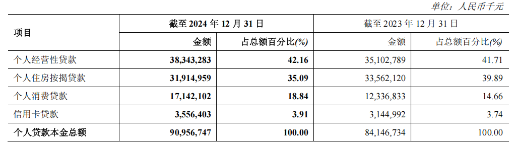 其中,个人经营性贷款约为383.43亿元,较2023年末的351.03亿元增加了32.4亿元;个人消费贷款约为171.42亿元,较2023年末的123.37亿元增加了48.05亿元;信用卡贷款约为35.56亿元,较2023年末的31.45亿元增加了4.11亿元。