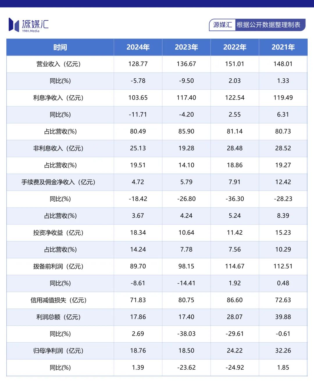 2024年,郑州银行实现营收128.77亿元,同比下降5.78%;归母净利润约为18.76亿元,同比微增1.39%。
