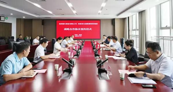 7月2日,省资源集团与郑州银行签署战略合作协议。集团党委书记、董事长马存旺,郑州银行党委书记、董事长赵飞出席签约仪式。集团党委委员、副总经理刘琳霞,郑州银行副行长孙润华代表双方签约。签约前,双方就加强交流、深化合作进行座谈。