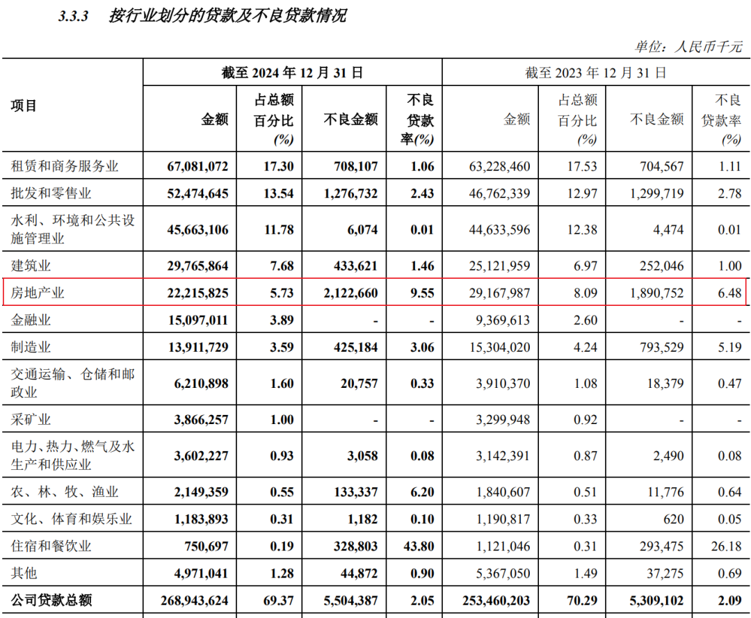 截至2024年末,郑州银行房地产业贷款余额222.16亿元(占贷款总额的5.73%),不良贷款余额21.23亿元,不良贷款率9.55%。