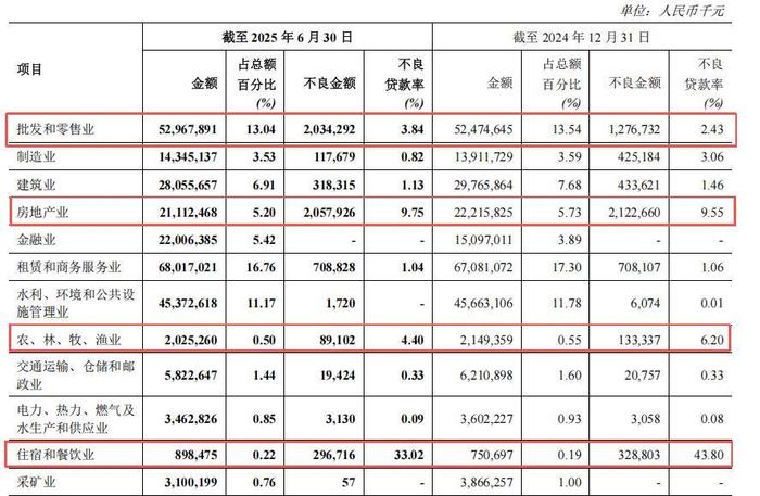 截至2025年6月末,郑州银行的公司贷款中,住宿和餐饮,房地产业,农林牧渔业,批发和零售业,不良贷款率分别为33.02%、9.75%、4.4%、3.84%。