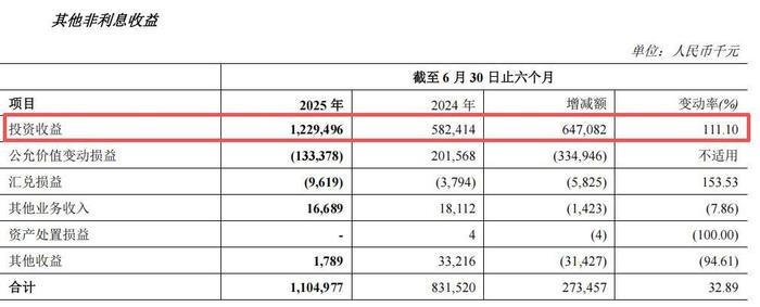 非利息收入中,投资收益12.29亿元,同比猛增111.10%。