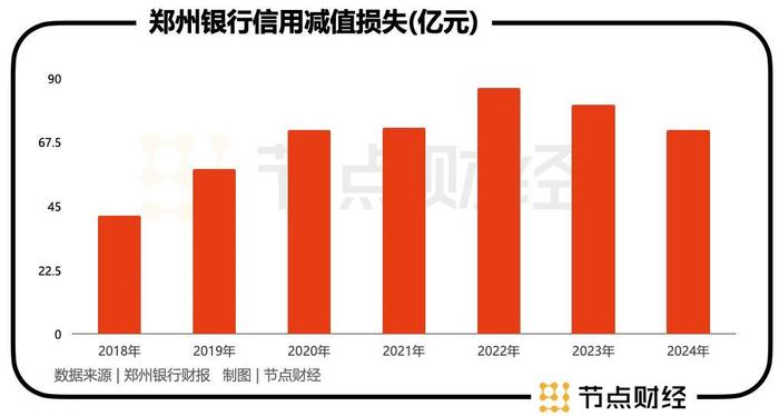 回拨时间轴,最近五年(2020年-2024年),郑州银行每年的信用减值损失都不低,分别为71.84亿元、72.63亿元、86.6亿元、80.75亿元、71.83亿元,均远超同期净利润。