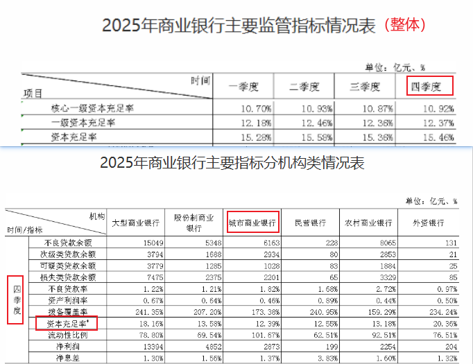 就同业水平来看,国家金融监督管理总局数据显示,2025年4季度末银行业整体核心一级资本充足率、一级资本充足率、资本充足率分别为10.92%、12.37%、15.46%,其中城商行期末资本充足率均值为12.39%,无论是行业整体,亦或是城商行同赛道,郑州银行均与指标平均水平存在明显差距。