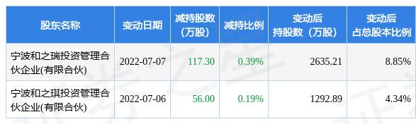 7月8日兴瑞科技发布公告《兴瑞科技:关于持股5%以上股东股份减持计划实施完毕的公告》,其股东宁波和之琪投资管理合伙企业(有限合伙)、宁波和之瑞投资管理合伙企业(有限合伙)于2022年6月27日至2022年7月7日间合计减持173.3万股,占公司目前总股本的0.5818%,变动期间该股股价下跌5.4%,截止7月7日收盘报17.88元。