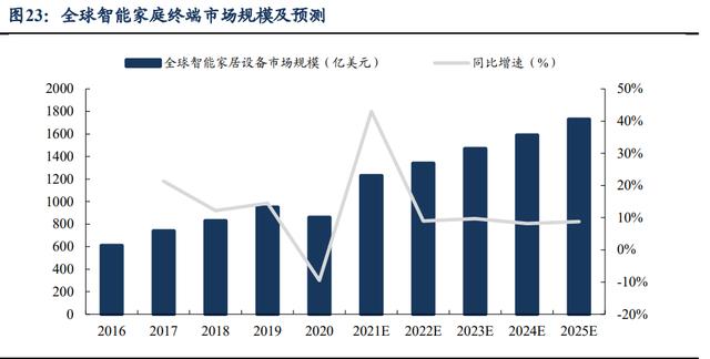 智能家庭终端产品加速落地,全屋智能化驱动市场规模持续增长。在新型基础设施层,5G 技术逐步普及,带动物联网和人工智能应用的落地和推广,并给智能终端行业带来新的发展机遇。在需求端,终端用户的可支配收入提高叠加消费观念升级,对智能家居设备的消费需求从娱乐、尝鲜逐步向提高生活质量全面转移。在供给端,智能家居平台生态的不断完善推进终端设备的互联互通,推动智能家庭终端产品涵盖面逐步变广走向全屋智能,智能家居行业加速成熟。同时,业内厂商的技术创新能力和产品供货能力也在逐步增强,产品丰富度提升,智能家庭终端产品价格预计将进一步下探,驱动市场发展进一步提速。