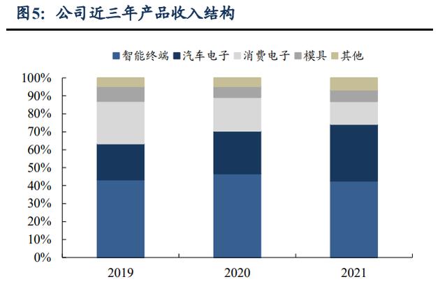 公司营收出现向上加速拐点,汽车电子业务占比提升。2021 年公司总营收达 12.5 亿元,同比增速重回高点达 20%。从历年营收情况及产品收入结构来看,收入的高增长主要系 2021 年汽车电子产品收入同比增长 60%达 3.9 亿元,占总营收比重同比增长 8.0ppt 达 32%。尤其是在新能源汽车领域,公司通过与松下等大客户的同步研发实现了新能源汽车 PDU、BDU 等部件用嵌塑件产品的突破,BDU精密镶嵌注塑件、鱼眼端子、连接器等产品进入头部新能源汽车厂商供应链,带来汽车电子业务的快速增长。