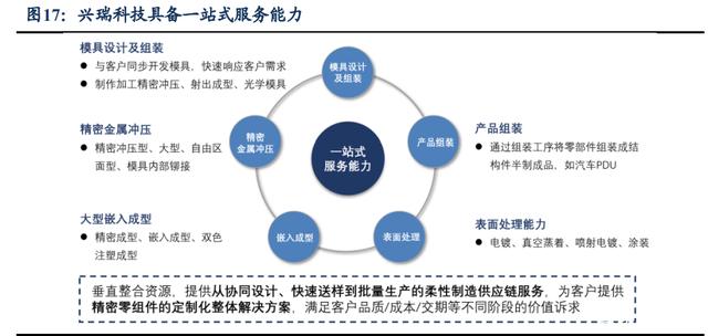公司拥有同步研发及垂直整合资源的能力,可提供具有国际一流水准的高品质产品。公司自成立以来一直致力于精密模具和精密电子零部件产品的技术研究和工艺探索,能够提供一站式资源整合能力,具备包括模具设计与制造、冲压、注塑、金属电镀、模具制造、组装在内的全制程工艺。在下游产品形态不断更迭的环境下,具备独立设计、生产能力的兴瑞科技可为客户提供不同价值、不同批量的高品质定制服务,巩固公司在产业链中的优势地位。