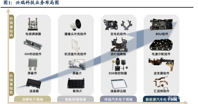 公司聚焦精密零组件二十余载,从消费电子逐步拓展至智能终端与新能源汽车领域。1)2001-2009 年为起步阶段。兴瑞科技期初主要产品为 TV-Tuner(电视调谐器零组件)。2008 年起公司跟随下游客户从消费电子业务积极拓展至智能终端和汽车电子业务。2)2010-2017 年为拓展转型阶段,跟随业界领先日本厂商合作研发镶嵌注塑工艺,正式进军汽车电子领域。公司持续进行业务战略转型,在智能终端领域,跟随 TECHNICOLOR 等客户布拓展至智能网关、智能音箱、智能电视等智能终端品类。在汽车电子领域,公司自 2012 年起正式进军汽车电子,开始研发汽车电子连接器和精密结构件,开拓更多汽车电子客户。3)2018-2022 年为快速发展阶段,协同松下研发 BDU、PDU 等部件用镶嵌注塑件,切入新能源汽车行业多个知名车企供应链。2018 年公司与松下合作开发 BDU、PDU,掌握新能源车用嵌塑件生产工艺,通过核心客户松下成为宝马、尼桑、通用等车企供应商,并逐步在国内拓展汇川、宁德时代、国轩高科等客户,进一步切入国内长安、理想等知名车企供应体系。同时公司前瞻性布局,合资成立热管理公司,为公司长期发展奠定基础。