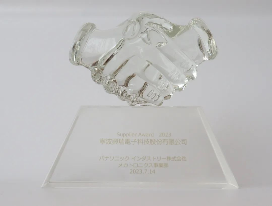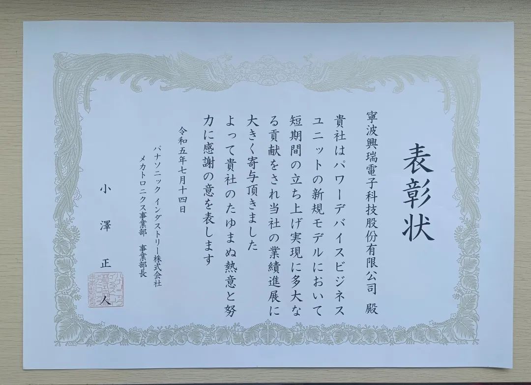 会上,松下机电机构控制部品事业部部长小泽先生亲自向兴瑞科技授予表彰,特别表彰兴瑞科技在松下机电电源设备事业部新机种开发中,为实现短交期而做出了重大贡献,同时为松下机电的业绩进展做出了突出贡献,对兴瑞科技团队坚持不懈的努力与对工作的热情表示由衷的感谢。