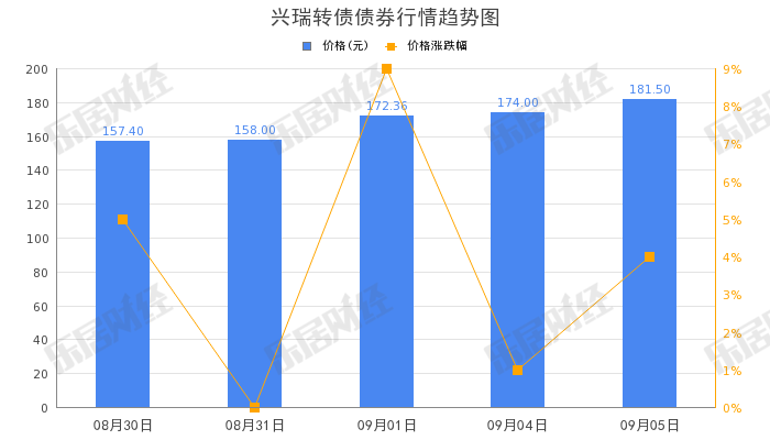 09月06日,“兴瑞转债”(127090)下午盘拉高,截至15:10,涨幅18.13%,报214.40元。总成交量113.60万手,成交额22.28亿元。