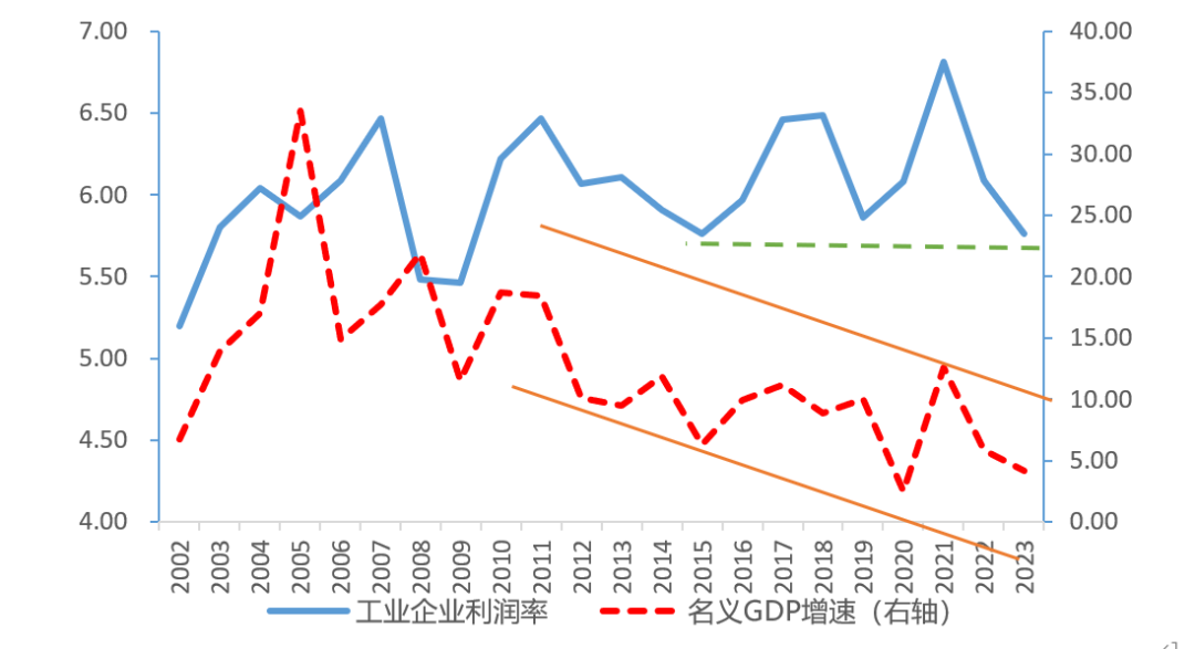 过去二十年间,我们处于信息技术飞速发展的时期,但是“科技不断突破”很可能是我们的错觉:事实上,我们在很多关键领域的科技已经很长时间没有产生实质性的飞跃了,无论是航天技术、信息技术还是生物技术,近些年的发展更多的是在于“广度的拓展”和“效率的提升”,而非“高纬度的跨越”,尤其是信息技术。在2021年,互联网在美国、中国、英国的渗透率提升已经逐渐趋缓,世界主要经济体的GDP增速也在下行,我们需要一场技术的大革新来打破僵局。近年我国名义GDP增速有所回落,2023年,工业企业利润率为5.76%,与2015年工业企业利润率持平,当前我们处于产业动能新旧转化的阶段,外延式增长为主的传统动能对经济的推动力量较为不足,经济需要由效能更高的新质生产力焕发活力。