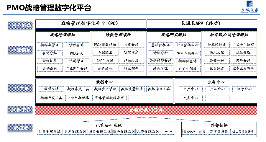 长城证券自主研发“战略管理数字化平台”,采用人工智能、大数据与云原生等先进技术,创新性提供了科学完整的战略管理方法论。平台自2022年12月上线运行,覆盖公司8条业务线,30个部门、15家分公司和全体3000余名员工,人均登录次数26次,是公司较为活跃的管理系统。平台包含战略管理、战略研究、绩效管理、控参股企业管理四大业务模块。该平台荣获CIFS金智杯“2023年度券商数字化转型优秀案例奖”和中国华能集团“2023年度管理创新成果”一等奖。