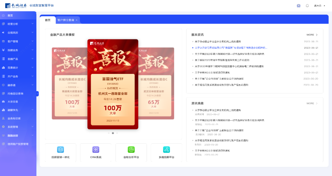 长城财富智慧平台立足于长城证券十四五战略,是长城证券财富管理业务上线、人员上线、管理上线的重要举措。金融科技研发中心(筹)利用人工智能、大数据、云原生等技术,实现客户服务、客户运营、投顾管理、金融产品、衍生品服务、分支机构三级管理、线上线下融合的统一入口、统一管理。目前该平台已广泛应用于财富管理总部、网络金融部、信用业务部、100多家分支机构的人员上线、业务上线、管理上线。该平台2023年荣获人民日报社《证券时报》“首届中国证券业财富经纪类数字化优秀践行者案例君鼎奖”。