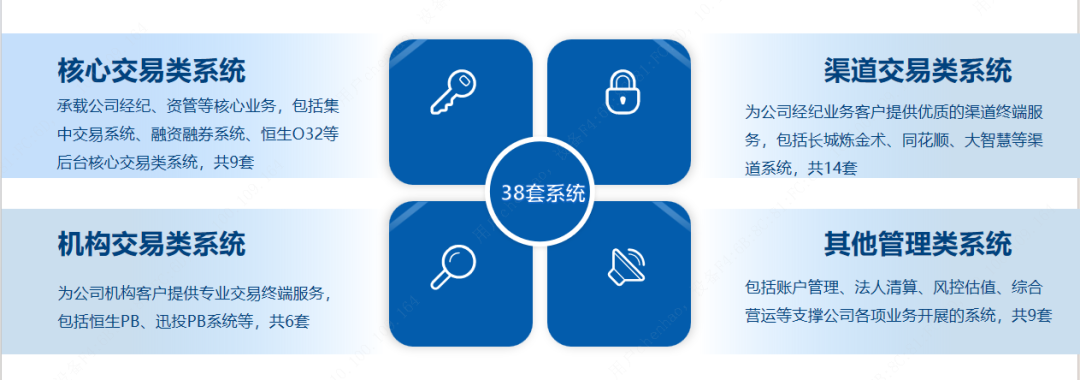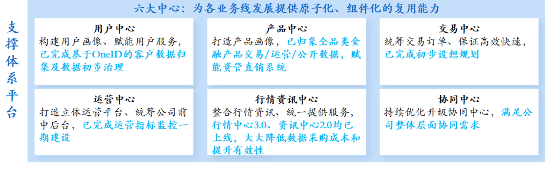 公司金融科技十四五规划指出,要打造以六大业务中心为主体的支撑体系赋能平台,构建企业级可复用能力中心,为各业务线发展提供原子化、组件化的复用能力。2023年,在用户中心方面,完成客户中心一期开发工作,打通各业务系统,完成基于OneID的客户数据模型建设;产品中心方面,完成金融产品非公募数据的采集及整合;运营中心方面,完成运营中心一期建设上线,共计完成33项监控内容及78项指标的开发;行情中心完成3.0建设,完成行情基础数据、衍生指标服务等行情数据服务建设;交易中心已完成新一代核心系统规划方案建设并通过内部评审;协同中心方面,跟随科创金融智慧生态平台建设工作同步推进。