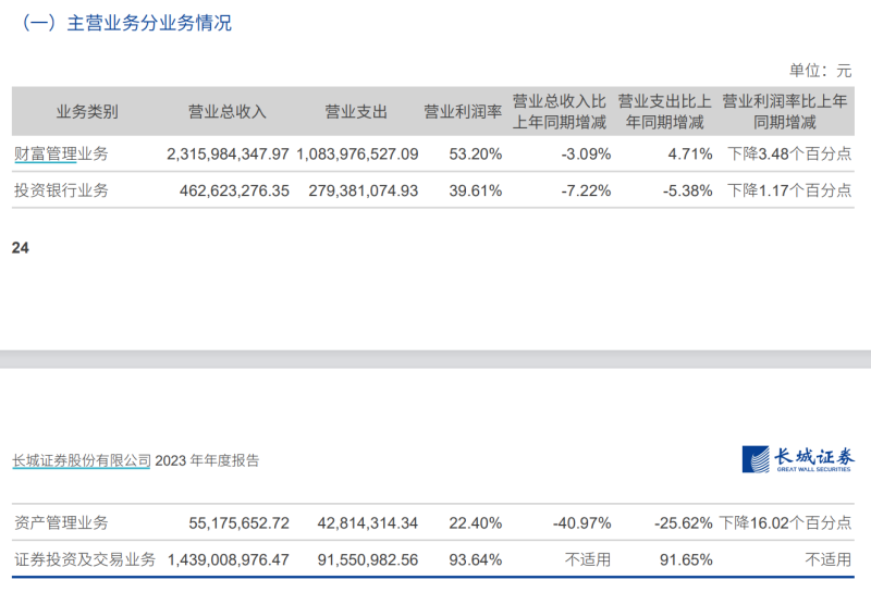 从具体业务板块来看,财富管理业务依旧是营收“主力军”,贡献23.16亿元营收,较上年减少3.09%;营业利润率达53.20%,同比下降3.48个百分点。