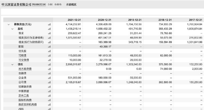 根据Wind数据,明显可以发现,在2017年至2021年期间,中天国富证券增长最为明显的是增发(投行作为主承销商)承销金额以及债权承销金额。其中增发承销金额由27.6亿增至107.5亿元,翻了近四倍。