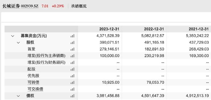 长城证券的投行业务也呈现下滑趋势,净收入从2019年的5.97亿元降至2023年的4.63亿元,年复合增速为-5%。从承销概况来看,2023年总金额为437亿元,较2021年的535亿元明显下降,其中增发业务承销金额降幅最为显著,由16.9亿元降至10亿元,下降40%。