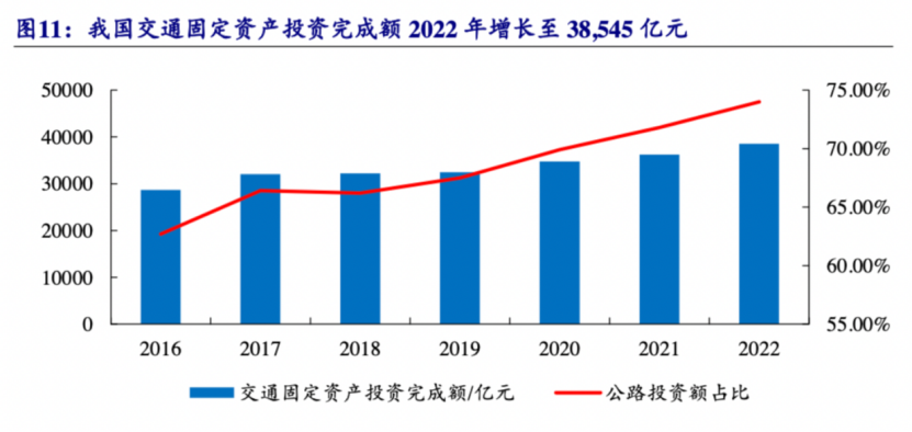 另一方面,我国交通基础设施建设总投资保持在较高水平,交通建设投资规模在高位继续保持增长。根据交通运输部历年发布《交通运输行业发展统计公报》,我国交通固定资产投资完成额由2016年的28685亿元增长至2022年的38545亿元,年复合增长率为5.05%。