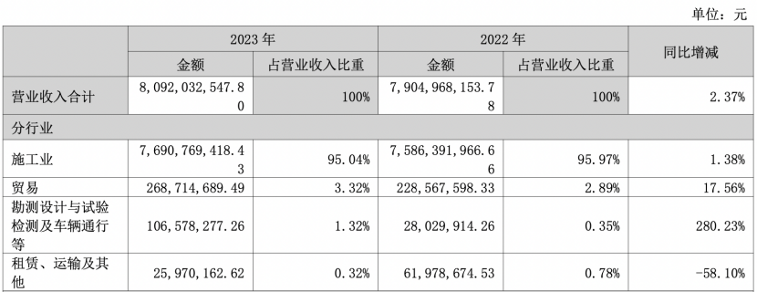 从新疆交建的业务板块来看,施工业务系公司的业绩基石。数据显示,2023年公司施工业务营收为76.91亿元,占总营业收入比重超过95%,且同比增长1.38%。