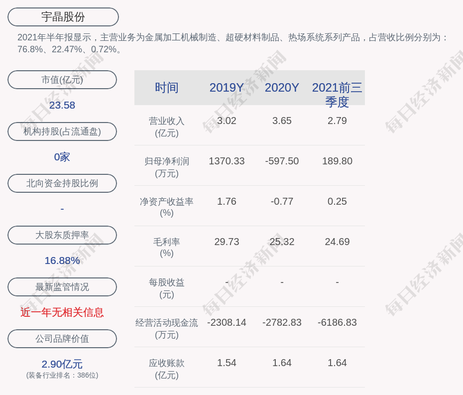 2021年半年报显示,宇晶股份的主营业务为金属加工机械制造、超硬材料制品、热场系统系列产品,占营收比例分别为:76.8%、22.47%、0.72%。