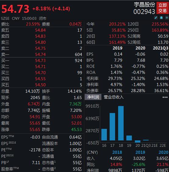 公开资料显示,宇晶股份主要业务为:精密数控机床设备的研发、设计、生产和销售。宇晶股份三季报显示,公司在2021年前三季度实现营业收入2.79亿元,同比增长9.18%,归母净利润189.8万元,同比增长221.31%。