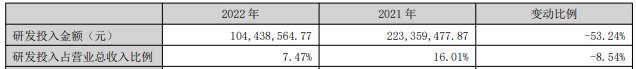 然而,凤凰网财经《投资观察》翻阅财报发现,华林证券研发投入出现“腰斩”。2022年,该公司研发投入金额为1.04亿元,较2021年的2.23亿元同比下降53.24%;研发投入占总营收的比例为7.47%,较2021年的16.01%下滑8.54%。