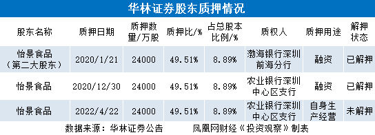 凤凰网财经《投资观察》梳理公告发现,出于融资需要,怡景食品早在2020年便将华林证券8.89%股权出质给渤海银行深圳前海分行;同年12月,这笔股权质押解除当天,又质押给农业银行深圳中心区支行。2022年4月,因自身生产经营需要,这笔股权质押解除当天又重新质押。