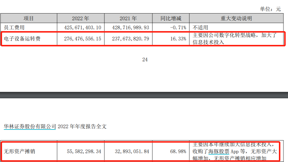 华林证券虽然表示,公司信息技术投入达4.6亿元,同比上涨32.64%,但大部分投入是在电子设备转运费和无形资产摊销上。