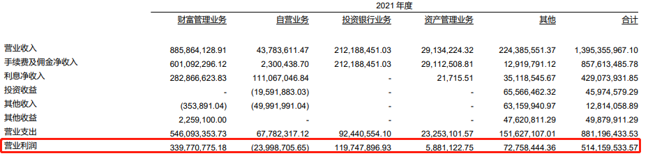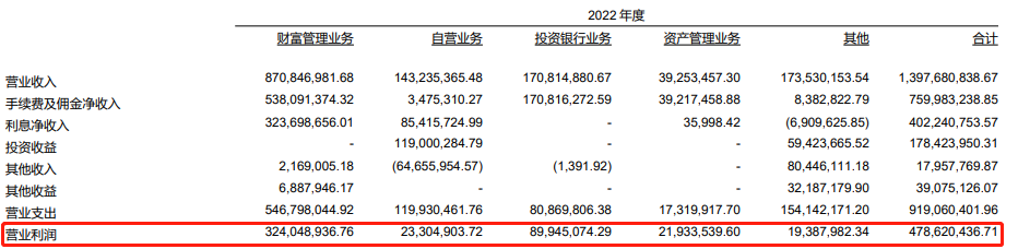 从具体业务来看,财富管理业务是华林证券最赚钱的业务,2022年营业利润达3.24亿元,占总营业利润的67.7%。不过,财富管理业务2022年承压,营业利润同比下降4.63%。