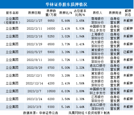 凤凰网财经《投资观察》梳理华林证券股东质押公告发现,2022年至今,该公司控股股东深圳市立业集团有限公司(下称“立业集团”)质押股权次数高达12次,其中有三次发生在今年。2023年2月7日,立业集团将1.05亿股份质押给中国银行深圳上步支行。同月24日,其将6200万股份质押给江苏银行深圳分行。次月8日,又将9300万股份质押给进出口银行深圳分行。